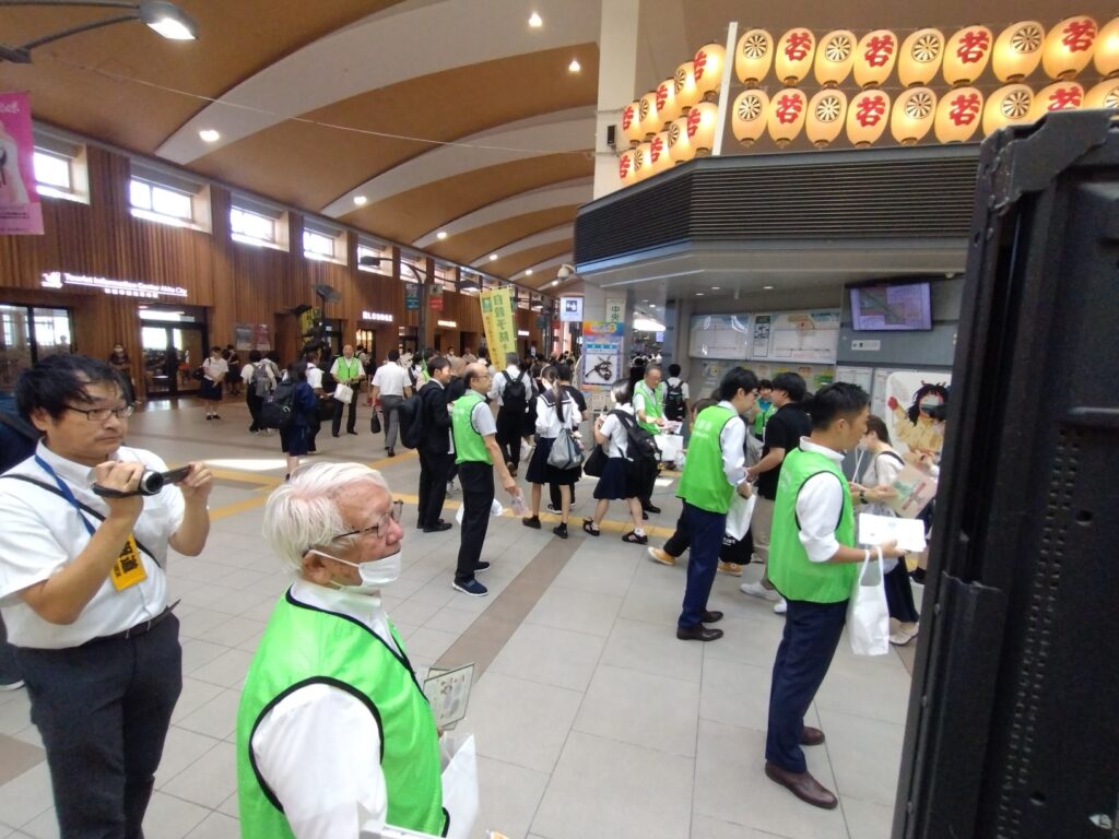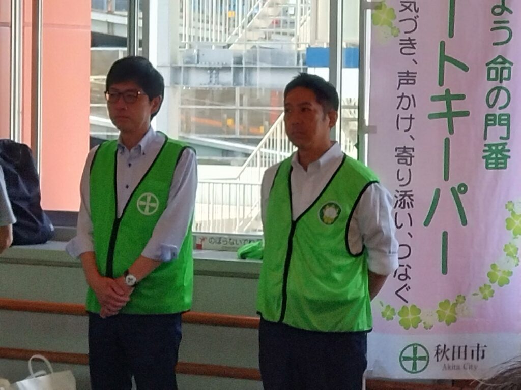 今回は、秋田県の鈴木知事、秋田市の沼谷市長はじめ、県・秋田市議会議員、秋田大学自殺予防総合研究センター、県・秋田市職員、ボランティア・民間団体の他、東日本旅客鉄道㈱秋田駅長と職員の皆さまに参加いただきました。朝7時台に、通勤通学で秋田駅前をご通行される約2,000人の方に、自殺予防に関するパンフレットやPR用ティシュなどを手渡しながら、相談機関等の情報提供と自殺予防への協力を呼びかけました。今年の1月から6月までの県警発表による自殺者数は前年同期間に比べて減少しておりますが、夏休み明けは自殺のリスクが高まると言われていることから、引き続き、相談会やマスメディア等による普及啓発等、自殺予防運動の取組みを続けてまいります。